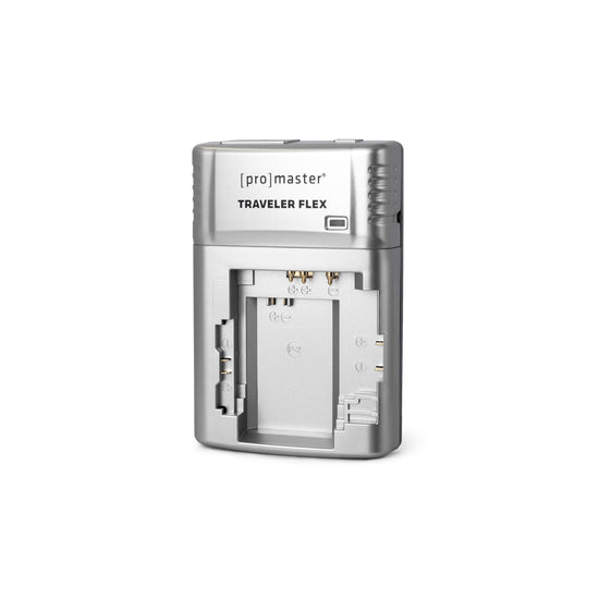 The ProMaster Traveler Flex Lithium-Ion Battery Charger is compact, lightweight, and easy to use: just plug it in and charge your battery. A convenient LED light turns red when your battery is charging and green when charging is complete. True to its name, the Traveler Flex is a great travel solution and has multi-voltage circuitry that accepts 120-240V for worldwide use with the included AC adapter (an outlet adapter is required for use in some countries). The Traveler Flex charges most batteries in two hours or less, and can be positioned flat on a desk or tabletop so that your batteries remain securely in place while charging.